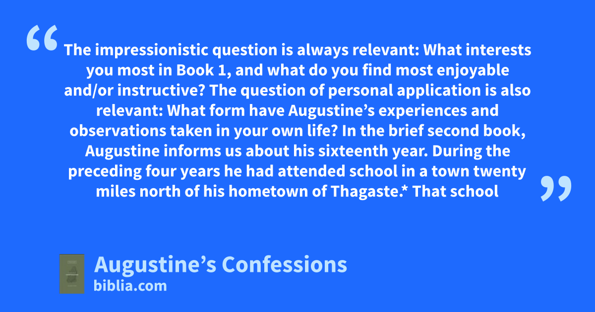 The impressionistic question is always relevant: What interests you most in Book 1, and what do you find most enjoyable and/or instructive? The question of personal application is also relevant: What form have Augustine’s experiences and observations taken in your own life? In the brief second book, Augustine informs us about his sixteenth year. During the preceding four years he had attended school in a town twenty miles north of his hometown of Thagaste.* That school