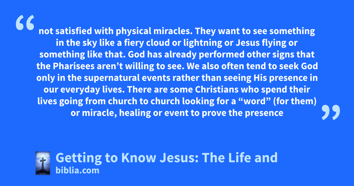 not satisfied with physical miracles. They want to see something in the sky like a fiery cloud or lightning or Jesus flying or something like that. God has already performed other signs that the Pharisees aren’t willing to see. We also often tend to seek God only in the supernatural events rather than seeing His presence in our everyday lives. There are some Christians who spend their lives going from church to church looking for a “word” (for them) or miracle, healing or event to prove the presence