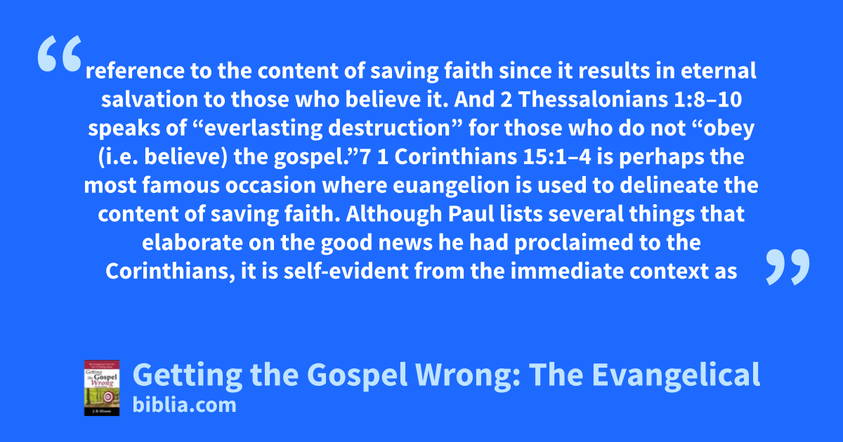reference to the content of saving faith since it results in eternal salvation to those who believe it. And 2 Thessalonians 1:8–10 speaks of “everlasting destruction” for those who do not “obey (i.e. believe) the gospel.”7 1 Corinthians 15:1–4 is perhaps the most famous occasion where euangelion is used to delineate the content of saving faith. Although Paul lists several things that elaborate on the good news he had proclaimed to the Corinthians, it is self-evident from the immediate context as