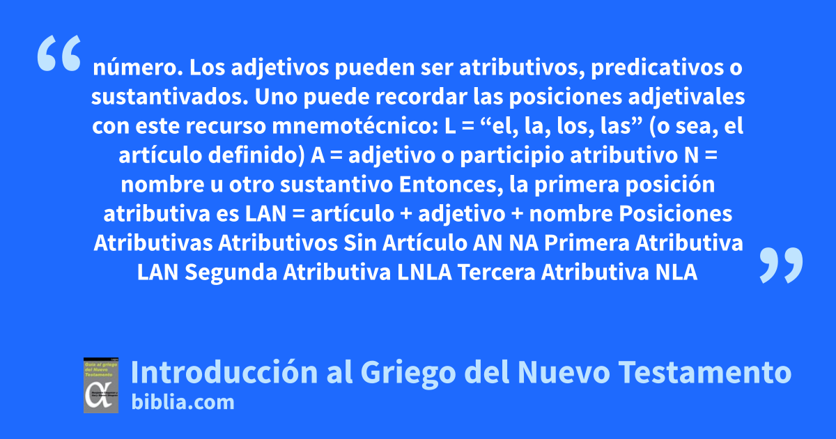 número. Los adjetivos pueden ser atributivos, predicativos o sustantivados. Uno puede recordar las posiciones adjetivales con este recurso mnemotécnico: L = “el, la, los, las” (o sea, el artículo definido) A = adjetivo o participio atributivo N = nombre u otro sustantivo Entonces, la primera posición atributiva es LAN = artículo + adjetivo + nombre Posiciones Atributivas Atributivos Sin Artículo AN NA Primera Atributiva LAN Segunda Atributiva LNLA Tercera Atributiva NLA