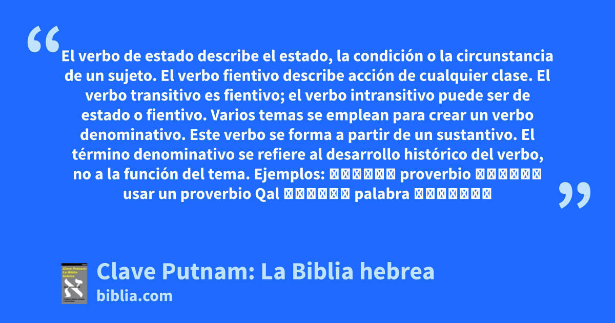 El verbo de estado describe el estado, la condición o la circunstancia de un sujeto. El verbo fientivo describe acción de cualquier clase. El verbo transitivo es fientivo; el verbo intransitivo puede ser de estado o fientivo. Varios temas se emplean para crear un verbo denominativo. Este verbo se forma a partir de un sustantivo. El término denominativo se refiere al desarrollo histórico del verbo, no a la función del tema. Ejemplos: מָשָׁל proverbio מָשַׁל usar un proverbio Qal דָּבָר palabra דִּבֵּר