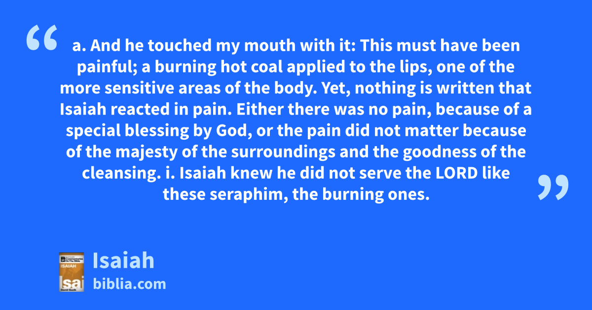 a. And he touched my mouth with it: This must have been painful; a burning hot coal applied to the lips, one of the more sensitive areas of the body. Yet, nothing is written that Isaiah reacted in pain. Either there was no pain, because of a special blessing by God, or the pain did not matter because of the majesty of the surroundings and the goodness of the cleansing. i. Isaiah knew he did not serve the LORD like these seraphim, the burning ones.