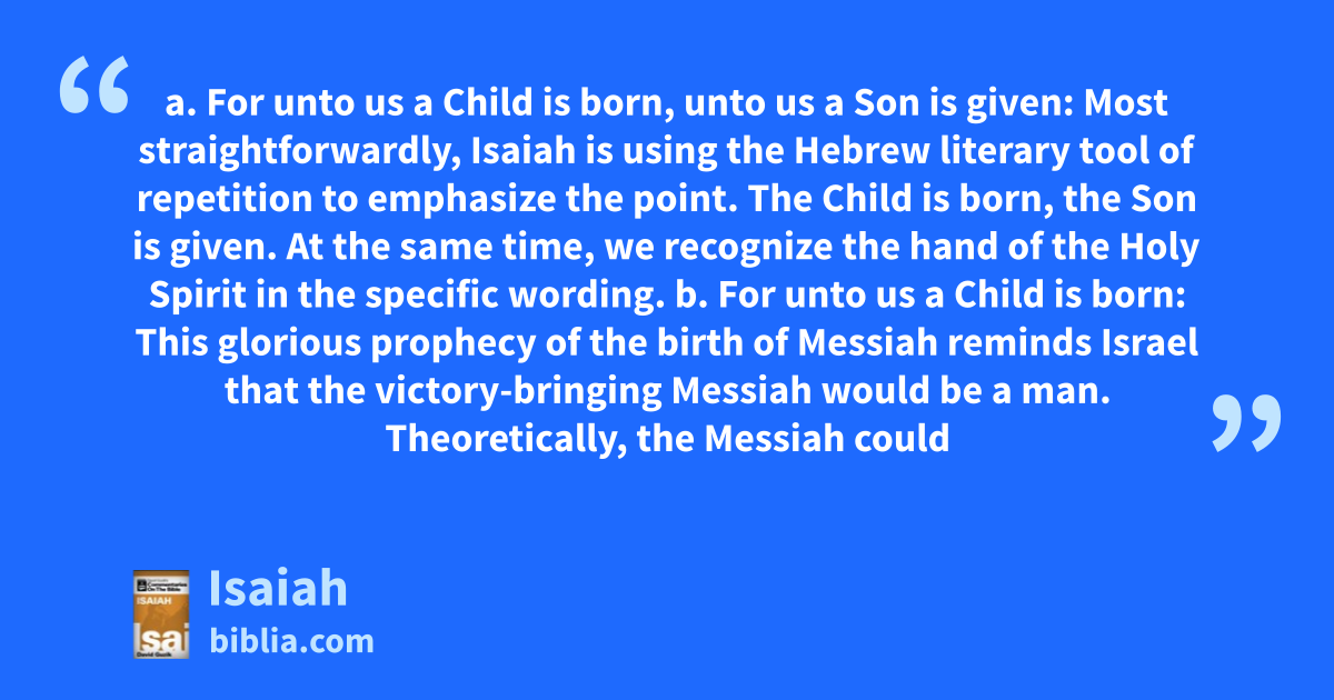 a. For unto us a Child is born, unto us a Son is given: Most straightforwardly, Isaiah is using the Hebrew literary tool of repetition to emphasize the point. The Child is born, the Son is given. At the same time, we recognize the hand of the Holy Spirit in the specific wording. b. For unto us a Child is born: This glorious prophecy of the birth of Messiah reminds Israel that the victory-bringing Messiah would be a man. Theoretically, the Messiah could