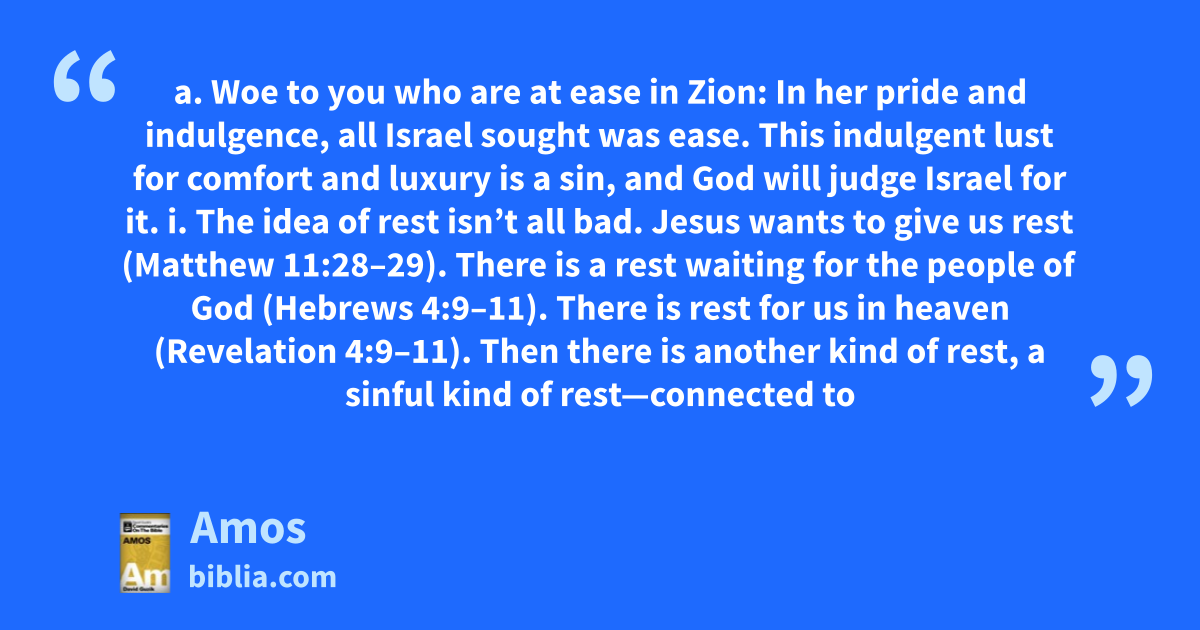 a. Woe to you who are at ease in Zion: In her pride and indulgence, all Israel sought was ease. This indulgent lust for comfort and luxury is a sin, and God will judge Israel for it. i. The idea of rest isn’t all bad. Jesus wants to give us rest (Matthew 11:28–29). There is a rest waiting for the people of God (Hebrews 4:9–11). There is rest for us in heaven (Revelation 4:9–11). Then there is another kind of rest, a sinful kind of rest—connected to