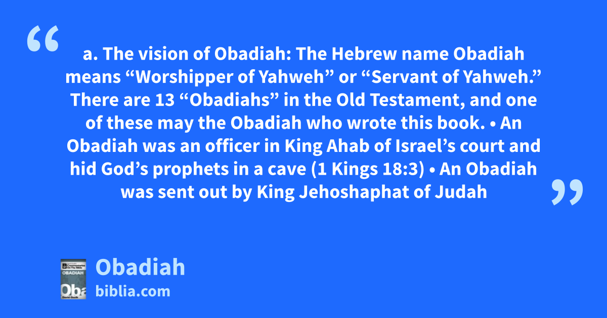 a. The vision of Obadiah: The Hebrew name Obadiah means “Worshipper of Yahweh” or “Servant of Yahweh.” There are 13 “Obadiahs” in the Old Testament, and one of these may the Obadiah who wrote this book. • An Obadiah was an officer in King Ahab of Israel’s court and hid God’s prophets in a cave (1 Kings 18:3) • An Obadiah was sent out by King Jehoshaphat of Judah