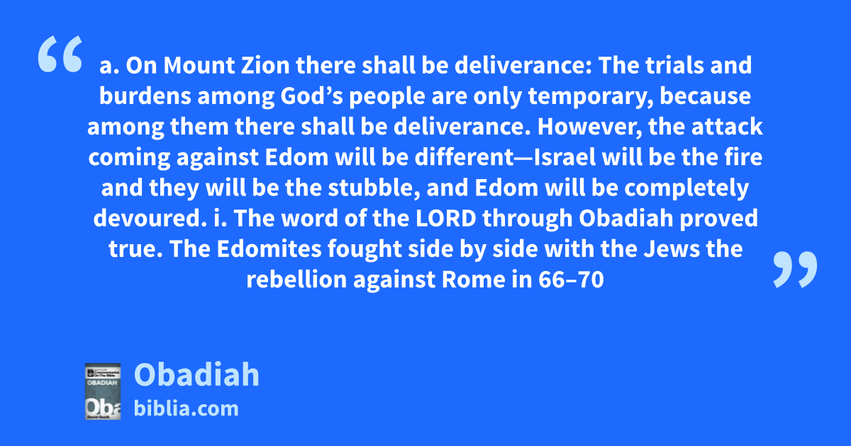 a. On Mount Zion there shall be deliverance: The trials and burdens among God’s people are only temporary, because among them there shall be deliverance. However, the attack coming against Edom will be different—Israel will be the fire and they will be the stubble, and Edom will be completely devoured. i. The word of the LORD through Obadiah proved true. The Edomites fought side by side with the Jews the rebellion against Rome in 66–70