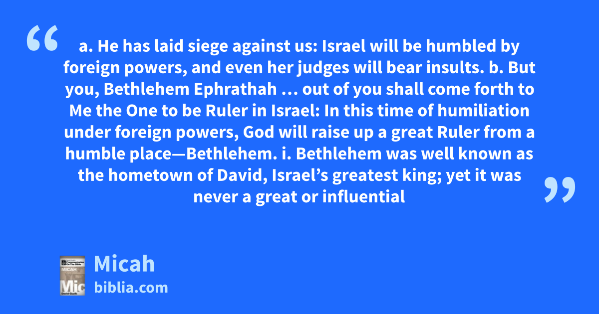 a. He has laid siege against us: Israel will be humbled by foreign powers, and even her judges will bear insults. b. But you, Bethlehem Ephrathah … out of you shall come forth to Me the One to be Ruler in Israel: In this time of humiliation under foreign powers, God will raise up a great Ruler from a humble place—Bethlehem. i. Bethlehem was well known as the hometown of David, Israel’s greatest king; yet it was never a great or influential