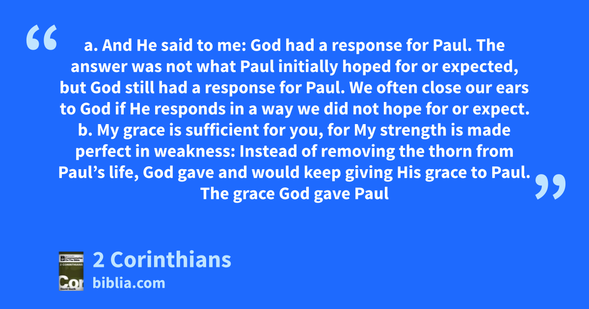 a. And He said to me: God had a response for Paul. The answer was not what Paul initially hoped for or expected, but God still had a response for Paul. We often close our ears to God if He responds in a way we did not hope for or expect. b. My grace is sufficient for you, for My strength is made perfect in weakness: Instead of removing the thorn from Paul’s life, God gave and would keep giving His grace to Paul. The grace God gave Paul