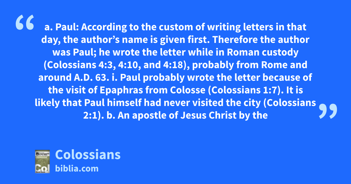a. Paul: According to the custom of writing letters in that day, the author’s name is given first. Therefore the author was Paul; he wrote the letter while in Roman custody (Colossians 4:3, 4:10, and 4:18), probably from Rome and around A.D. 63. i. Paul probably wrote the letter because of the visit of Epaphras from Colosse (Colossians 1:7). It is likely that Paul himself had never visited the city (Colossians 2:1). b. An apostle of Jesus Christ by the