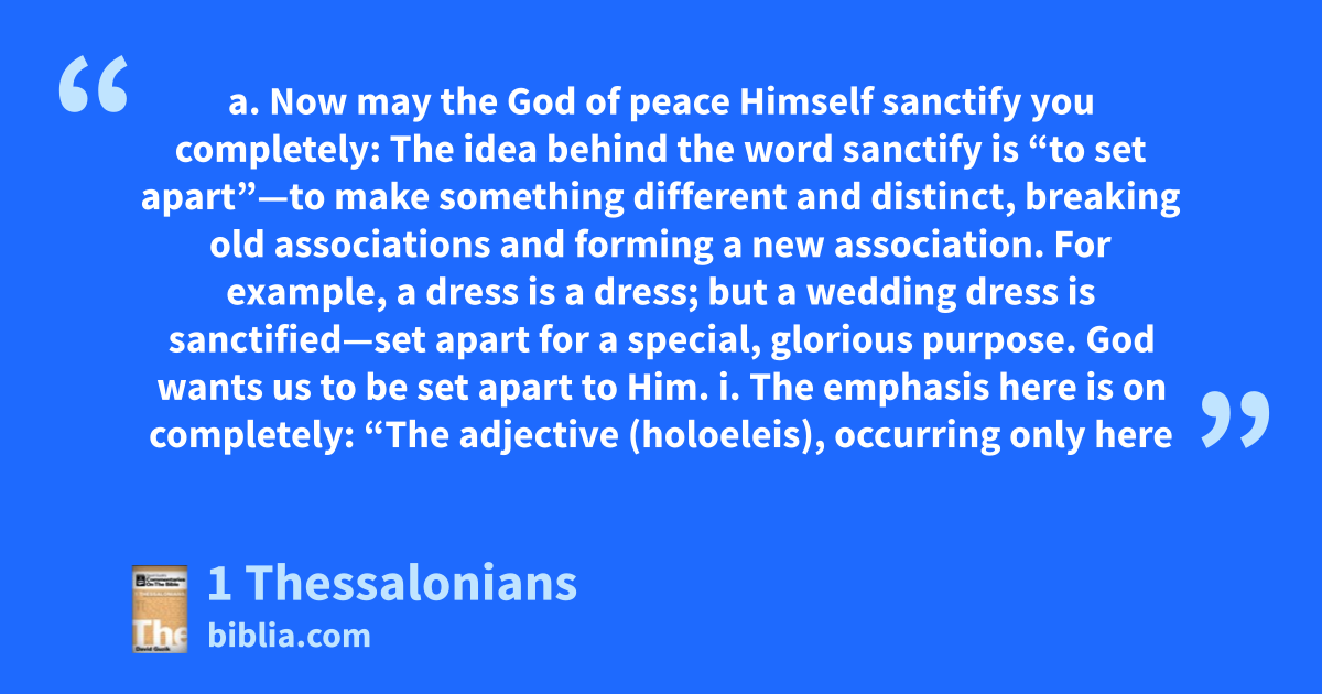 a. Now may the God of peace Himself sanctify you completely: The idea behind the word sanctify is “to set apart”—to make something different and distinct, breaking old associations and forming a new association. For example, a dress is a dress; but a wedding dress is sanctified—set apart for a special, glorious purpose. God wants us to be set apart to Him. i. The emphasis here is on completely: “The adjective (holoeleis), occurring only here