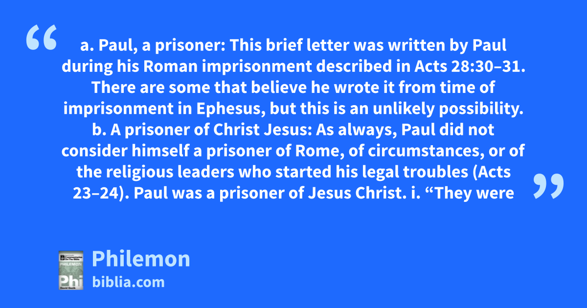 a. Paul, a prisoner: This brief letter was written by Paul during his Roman imprisonment described in Acts 28:30–31. There are some that believe he wrote it from time of imprisonment in Ephesus, but this is an unlikely possibility. b. A prisoner of Christ Jesus: As always, Paul did not consider himself a prisoner of Rome, of circumstances, or of the religious leaders who started his legal troubles (Acts 23–24). Paul was a prisoner of Jesus Christ. i. “They were