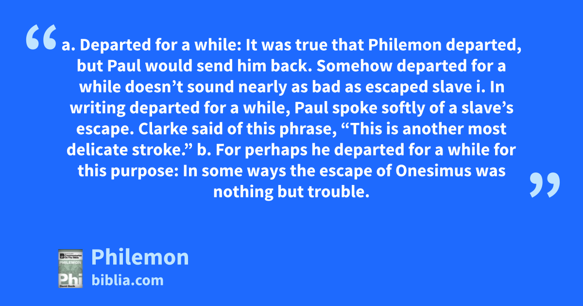 a. Departed for a while: It was true that Philemon departed, but Paul would send him back. Somehow departed for a while doesn’t sound nearly as bad as escaped slave i. In writing departed for a while, Paul spoke softly of a slave’s escape. Clarke said of this phrase, “This is another most delicate stroke.” b. For perhaps he departed for a while for this purpose: In some ways the escape of Onesimus was nothing but trouble.