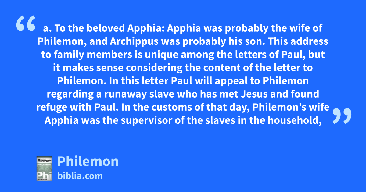 a. To the beloved Apphia: Apphia was probably the wife of Philemon, and Archippus was probably his son. This address to family members is unique among the letters of Paul, but it makes sense considering the content of the letter to Philemon. In this letter Paul will appeal to Philemon regarding a runaway slave who has met Jesus and found refuge with Paul. In the customs of that day, Philemon’s wife Apphia was the supervisor of the slaves in the household,