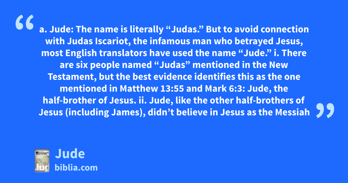a. Jude: The name is literally “Judas.” But to avoid connection with Judas Iscariot, the infamous man who betrayed Jesus, most English translators have used the name “Jude.” i. There are six people named “Judas” mentioned in the New Testament, but the best evidence identifies this as the one mentioned in Matthew 13:55 and Mark 6:3: Jude, the half-brother of Jesus. ii. Jude, like the other half-brothers of Jesus (including James), didn’t believe in Jesus as the Messiah