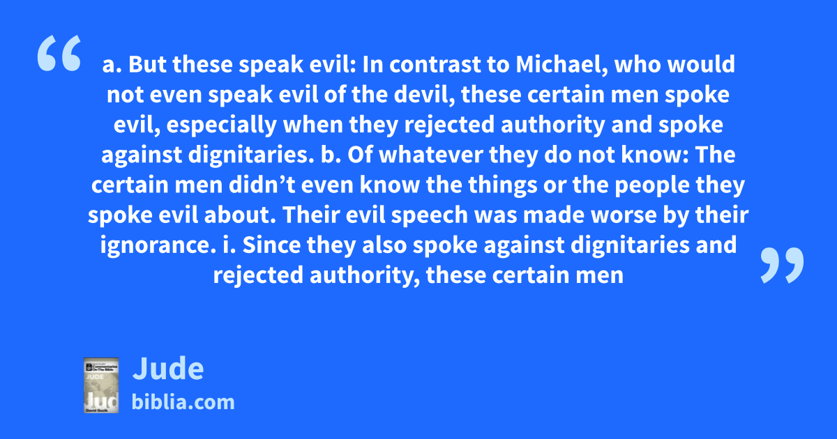 a. But these speak evil: In contrast to Michael, who would not even speak evil of the devil, these certain men spoke evil, especially when they rejected authority and spoke against dignitaries. b. Of whatever they do not know: The certain men didn’t even know the things or the people they spoke evil about. Their evil speech was made worse by their ignorance. i. Since they also spoke against dignitaries and rejected authority, these certain men