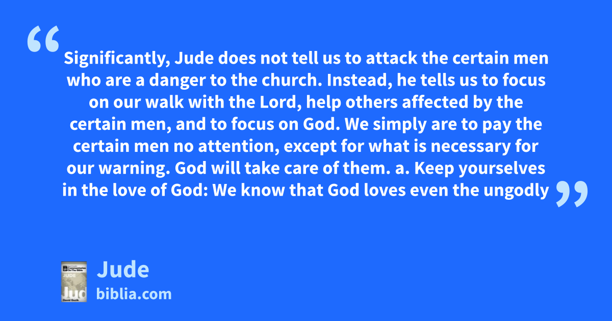 Significantly, Jude does not tell us to attack the certain men who are a danger to the church. Instead, he tells us to focus on our walk with the Lord, help others affected by the certain men, and to focus on God. We simply are to pay the certain men no attention, except for what is necessary for our warning. God will take care of them. a. Keep yourselves in the love of God: We know that God loves even the ungodly