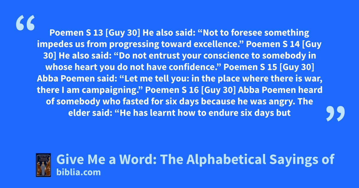 Poemen S 13 [Guy 30] He also said: “Not to foresee something impedes us from progressing toward excellence.” Poemen S 14 [Guy 30] He also said: “Do not entrust your conscience to somebody in whose heart you do not have confidence.” Poemen S 15 [Guy 30] Abba Poemen said: “Let me tell you: in the place where there is war, there I am campaigning.” Poemen S 16 [Guy 30] Abba Poemen heard of somebody who fasted for six days because he was angry. The elder said: “He has learnt how to endure six days but