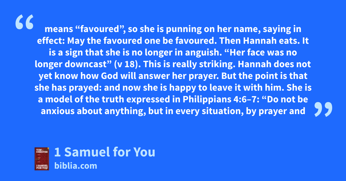 means “favoured”, so she is punning on her name, saying in effect: May the favoured one be favoured. Then Hannah eats. It is a sign that she is no longer in anguish. “Her face was no longer downcast” (v 18). This is really striking. Hannah does not yet know how God will answer her prayer. But the point is that she has prayed: and now she is happy to leave it with him. She is a model of the truth expressed in Philippians 4:6–7: “Do not be anxious about anything, but in every situation, by prayer and