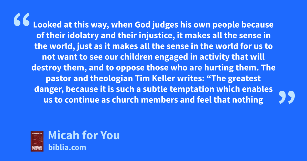 Looked at this way, when God judges his own people because of their idolatry and their injustice, it makes all the sense in the world, just as it makes all the sense in the world for us to not want to see our children engaged in activity that will destroy them, and to oppose those who are hurting them. The pastor and theologian Tim Keller writes: “The greatest danger, because it is such a subtle temptation which enables us to continue as church members and feel that nothing