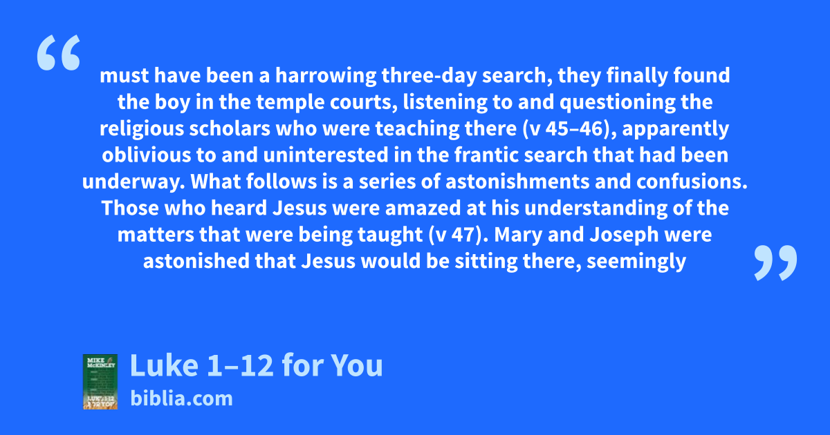 must have been a harrowing three-day search, they finally found the boy in the temple courts, listening to and questioning the religious scholars who were teaching there (v 45–46), apparently oblivious to and uninterested in the frantic search that had been underway. What follows is a series of astonishments and confusions. Those who heard Jesus were amazed at his understanding of the matters that were being taught (v 47). Mary and Joseph were astonished that Jesus would be sitting there, seemingly