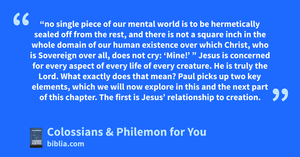 “no single piece of our mental world is to be hermetically sealed off from the rest, and there is not a square inch in the whole domain of our human existence over which Christ, who is Sovereign over all, does not cry: ‘Mine!’ ” Jesus is concerned for every aspect of every life of every creature. He is truly the Lord. What exactly does that mean? Paul picks up two key elements, which we will now explore in this and the next part of this chapter. The first is Jesus’ relationship to creation.