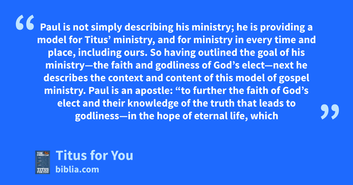 Paul is not simply describing his ministry; he is providing a model for Titus’ ministry, and for ministry in every time and place, including ours. So having outlined the goal of his ministry—the faith and godliness of God’s elect—next he describes the context and content of this model of gospel ministry. Paul is an apostle: “to further the faith of God’s elect and their knowledge of the truth that leads to godliness—in the hope of eternal life, which
