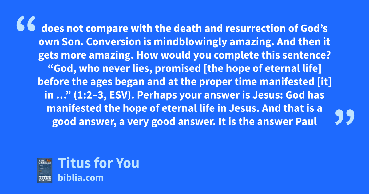 does not compare with the death and resurrection of God’s own Son. Conversion is mindblowingly amazing. And then it gets more amazing. How would you complete this sentence? “God, who never lies, promised [the hope of eternal life] before the ages began and at the proper time manifested [it] in …” (1:2–3, ESV). Perhaps your answer is Jesus: God has manifested the hope of eternal life in Jesus. And that is a good answer, a very good answer. It is the answer Paul