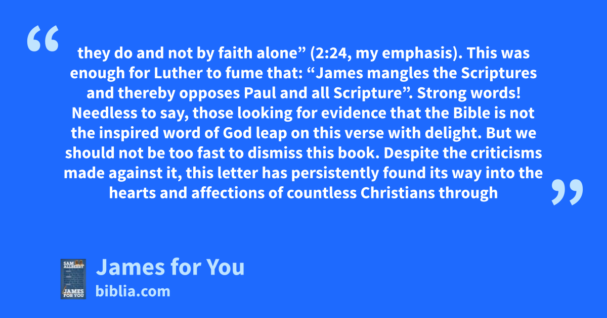 they do and not by faith alone” (2:24, my emphasis). This was enough for Luther to fume that: “James mangles the Scriptures and thereby opposes Paul and all Scripture”. Strong words! Needless to say, those looking for evidence that the Bible is not the inspired word of God leap on this verse with delight. But we should not be too fast to dismiss this book. Despite the criticisms made against it, this letter has persistently found its way into the hearts and affections of countless Christians through