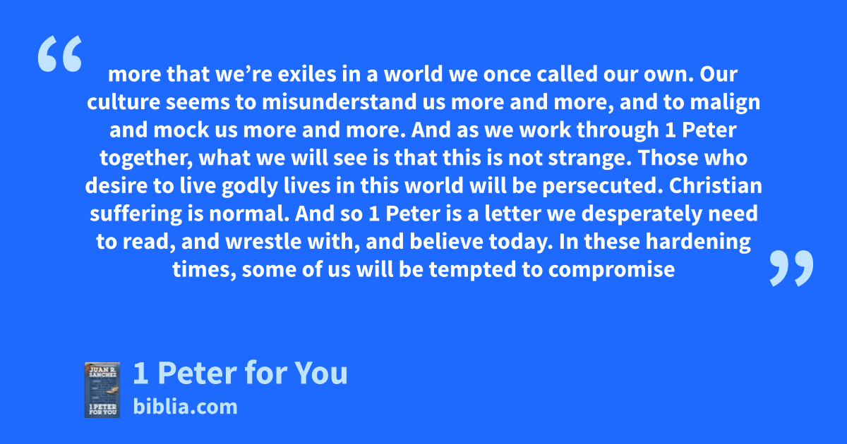 more that we’re exiles in a world we once called our own. Our culture seems to misunderstand us more and more, and to malign and mock us more and more. And as we work through 1 Peter together, what we will see is that this is not strange. Those who desire to live godly lives in this world will be persecuted. Christian suffering is normal. And so 1 Peter is a letter we desperately need to read, and wrestle with, and believe today. In these hardening times, some of us will be tempted to compromise