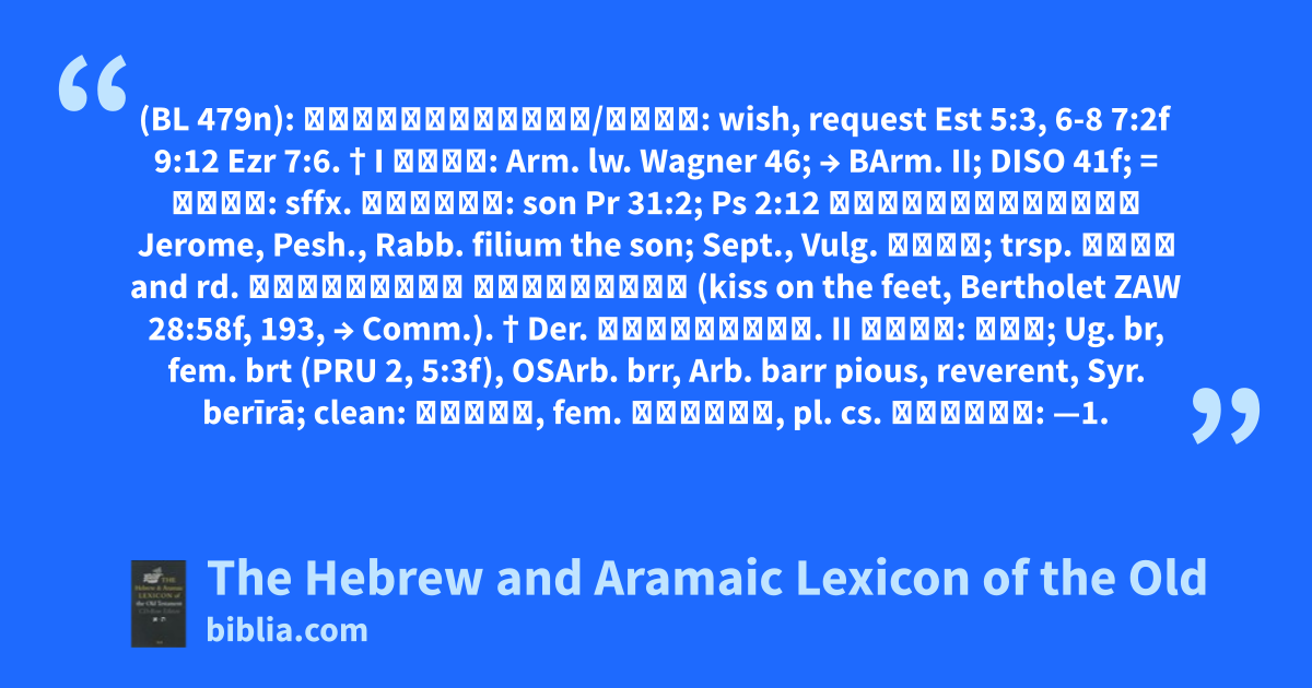 (BL 479n): בַּקָּשָׁתוֹ/תֵךְ: wish, request Est 5:3, 6-8 7:2f 9:12 Ezr 7:6. † I בַּר: Arm. lw. Wagner 46; → BArm. II; DISO 41f; = בֵּן: sffx. בְּרִי: son Pr 31:2; Ps 2:12 נַשְּׁקוּ־בַר Jerome, Pesh., Rabb. filium the son; Sept., Vulg. בֹּר; trsp. גילו and rd. נַשְּׁקוּ בְרַגְלָו (kiss on the feet, Bertholet ZAW 28:58f, 193, → Comm.). † Der. בַּרְקוֹס. II בַּר: ברר; Ug. br, fem. brt (PRU 2, 5:3f), OSArb. brr, Arb. barr pious, reverent, Syr. berīrā; clean: בָּֽר, fem. בָּרָה, pl. cs. בָּרֵי: —1.