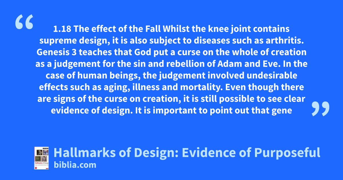 1.18 The effect of the Fall Whilst the knee joint contains supreme design, it is also subject to diseases such as arthritis. Genesis 3 teaches that God put a curse on the whole of creation as a judgement for the sin and rebellion of Adam and Eve. In the case of human beings, the judgement involved undesirable effects such as aging, illness and mortality. Even though there are signs of the curse on creation, it is still possible to see clear evidence of design. It is important to point out that gene
