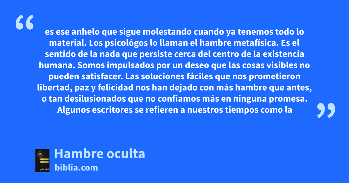es ese anhelo que sigue molestando cuando ya tenemos todo lo material. Los psicológos lo llaman el hambre metafísica. Es el sentido de la nada que persiste cerca del centro de la existencia humana. Somos impulsados por un deseo que las cosas visibles no pueden satisfacer. Las soluciones fáciles que nos prometieron libertad, paz y felicidad nos han dejado con más hambre que antes, o tan desilusionados que no confiamos más en ninguna promesa. Algunos escritores se refieren a nuestros tiempos como la