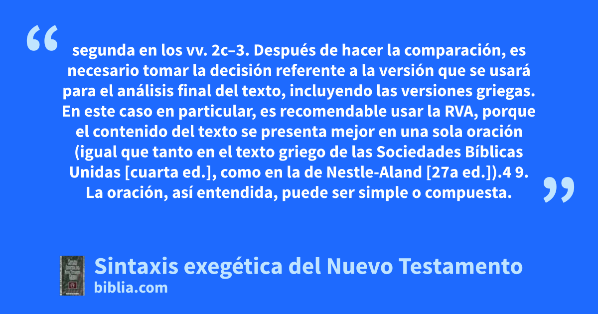 segunda en los vv. 2c–3. Después de hacer la comparación, es necesario tomar la decisión referente a la versión que se usará para el análisis final del texto, incluyendo las versiones griegas. En este caso en particular, es recomendable usar la RVA, porque el contenido del texto se presenta mejor en una sola oración (igual que tanto en el texto griego de las Sociedades Bíblicas Unidas [cuarta ed.], como en la de Nestle-Aland [27a ed.]).4 9. La oración, así entendida, puede ser simple o compuesta.