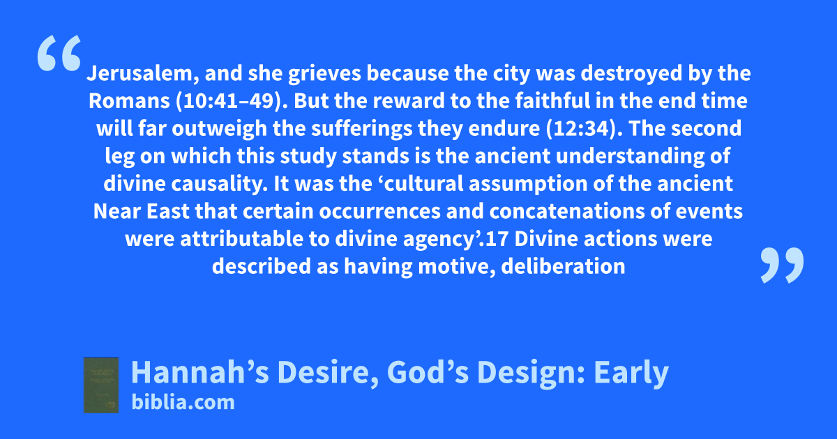 Jerusalem, and she grieves because the city was destroyed by the Romans (10:41–49). But the reward to the faithful in the end time will far outweigh the sufferings they endure (12:34). The second leg on which this study stands is the ancient understanding of divine causality. It was the ‘cultural assumption of the ancient Near East that certain occurrences and concatenations of events were attributable to divine agency’.17 Divine actions were described as having motive, deliberation