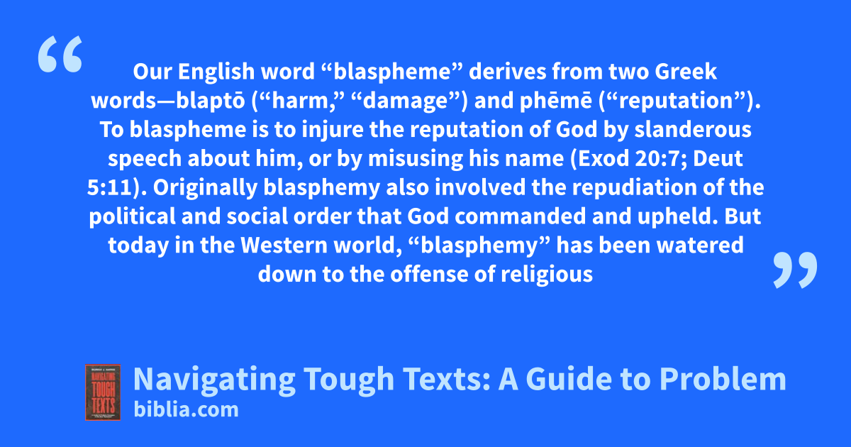 Our English word “blaspheme” derives from two Greek words—blaptō (“harm,” “damage”) and phēmē (“reputation”). To blaspheme is to injure the reputation of God by slanderous speech about him, or by misusing his name (Exod 20:7; Deut 5:11). Originally blasphemy also involved the repudiation of the political and social order that God commanded and upheld. But today in the Western world, “blasphemy” has been watered down to the offense of religious