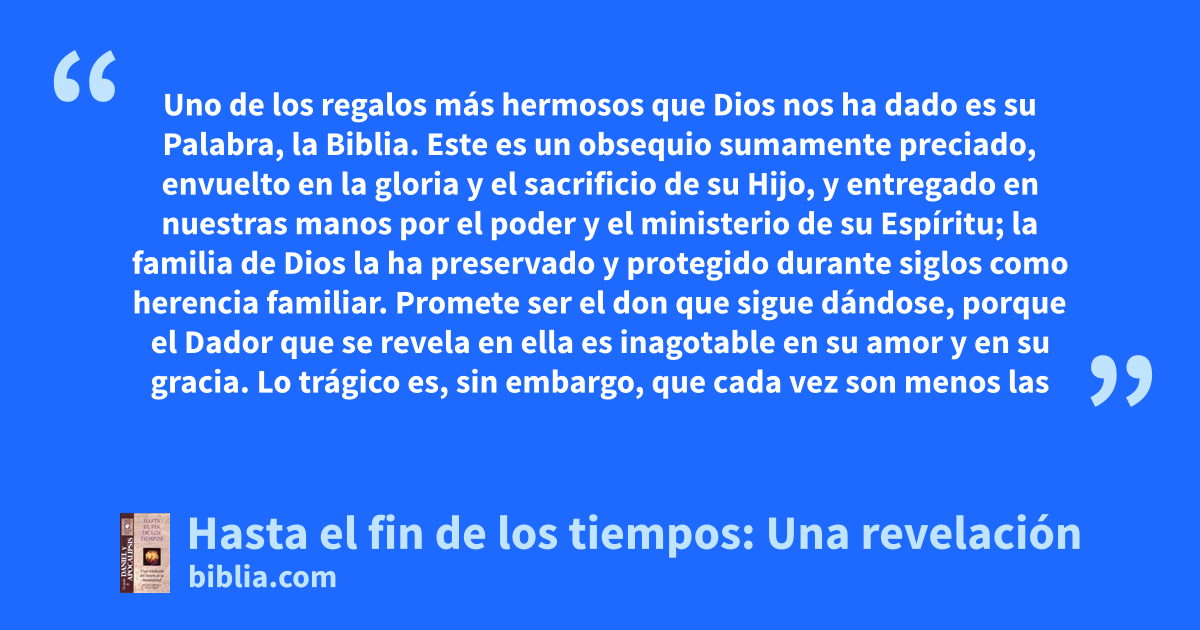 Uno de los regalos más hermosos que Dios nos ha dado es su Palabra, la Biblia. Este es un obsequio sumamente preciado, envuelto en la gloria y el sacrificio de su Hijo, y entregado en nuestras manos por el poder y el ministerio de su Espíritu; la familia de Dios la ha preservado y protegido durante siglos como herencia familiar. Promete ser el don que sigue dándose, porque el Dador que se revela en ella es inagotable en su amor y en su gracia. Lo trágico es, sin embargo, que cada vez son menos las