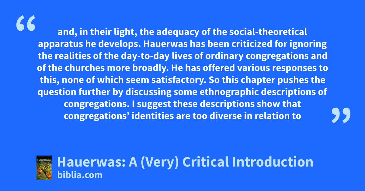 and, in their light, the adequacy of the social-theoretical apparatus he develops. Hauerwas has been criticized for ignoring the realities of the day-to-day lives of ordinary congregations and of the churches more broadly. He has offered various responses to this, none of which seem satisfactory. So this chapter pushes the question further by discussing some ethnographic descriptions of congregations. I suggest these descriptions show that congregations’ identities are too diverse in relation to