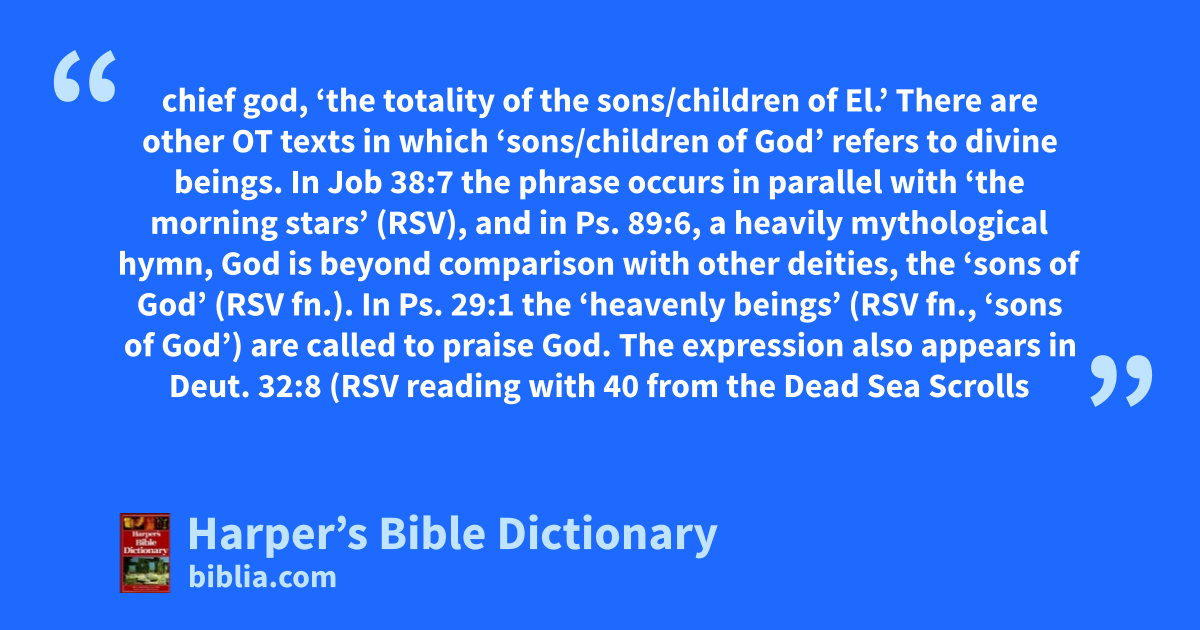 chief god, ‘the totality of the sons/children of El.’ There are other OT texts in which ‘sons/children of God’ refers to divine beings. In Job 38:7 the phrase occurs in parallel with ‘the morning stars’ (RSV), and in Ps. 89:6, a heavily mythological hymn, God is beyond comparison with other deities, the ‘sons of God’ (RSV fn.). In Ps. 29:1 the ‘heavenly beings’ (RSV fn., ‘sons of God’) are called to praise God. The expression also appears in Deut. 32:8 (RSV reading with 40 from the Dead Sea Scrolls