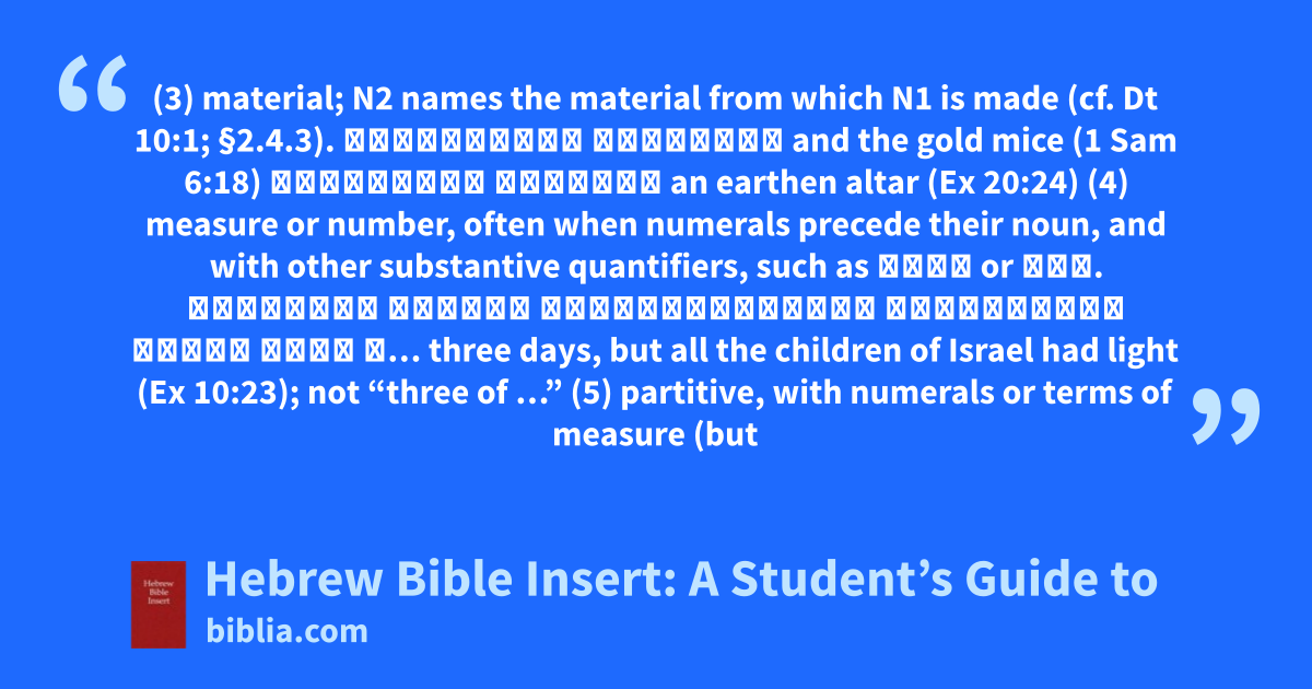 (3) material; N2 names the material from which N1 is made (cf. Dt 10:1; §2.4.3). וְכַבְּרֵי הַזָּהָב and the gold mice (1 Sam 6:18) מִזְבֵּחַ אֲדָמָה an earthen altar (Ex 20:24) (4) measure or number, often when numerals precede their noun, and with other substantive quantifiers, such as כֹּל or רֹב. שְׁלשֶׁת יָמִים וּלְכָל־בְּנֵי יִשְׂרָאֵל הָיָה אוֹר ‍… three days, but all the children of Israel had light (Ex 10:23); not “three of …” (5) partitive, with numerals or terms of measure (but