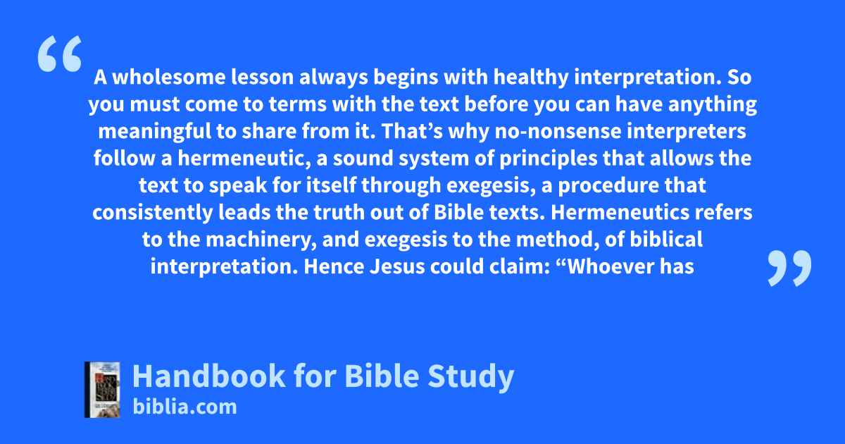 A wholesome lesson always begins with healthy interpretation. So you must come to terms with the text before you can have anything meaningful to share from it. That’s why no-nonsense interpreters follow a hermeneutic, a sound system of principles that allows the text to speak for itself through exegesis, a procedure that consistently leads the truth out of Bible texts. Hermeneutics refers to the machinery, and exegesis to the method, of biblical interpretation. Hence Jesus could claim: “Whoever has