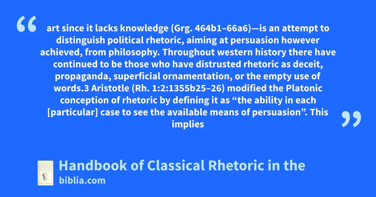 art since it lacks knowledge (Grg. 464b1–66a6)—is an attempt to distinguish political rhetoric, aiming at persuasion however achieved, from philosophy. Throughout western history there have continued to be those who have distrusted rhetoric as deceit, propaganda, superficial ornamentation, or the empty use of words.3 Aristotle (Rh. 1:2:1355b25–26) modified the Platonic conception of rhetoric by defining it as “the ability in each [particular] case to see the available means of persuasion”. This implies