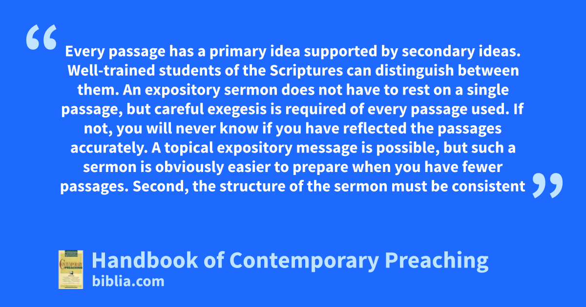 Every passage has a primary idea supported by secondary ideas. Well-trained students of the Scriptures can distinguish between them. An expository sermon does not have to rest on a single passage, but careful exegesis is required of every passage used. If not, you will never know if you have reflected the passages accurately. A topical expository message is possible, but such a sermon is obviously easier to prepare when you have fewer passages. Second, the structure of the sermon must be consistent