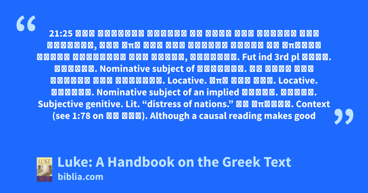 21:25 Καὶ ἔσονται σημεῖα ἐν ἡλίῳ καὶ σελήνῃ καὶ ἄστροις, καὶ ἐπὶ τῆς γῆς συνοχὴ ἐθνῶν ἐν ἀπορίᾳ ἤχους θαλάσσης καὶ σάλου, ἔσονται. Fut ind 3rd pl εἰμί. σημεῖα. Nominative subject of ἔσονται. ἐν ἡλίῳ καὶ σελήνῃ καὶ ἄστροις. Locative. ἐπὶ τῆς γῆς. Locative. συνοχὴ. Nominative subject of an implied ἔσται. ἐθνῶν. Subjective genitive. Lit. “distress of nations.” ἐν ἀπορίᾳ. Context (see 1:78 on ἐν οἷς). Although a causal reading makes good