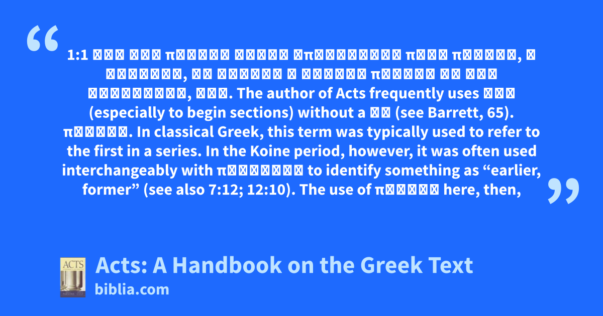 1:1 Τὸν μὲν πρῶτον λόγον ἐποιησάμην περὶ πάντων, ὦ Θεόφιλε, ὧν ἤρξατο ὁ Ἰησοῦς ποιεῖν τε καὶ διδάσκειν, μὲν. The author of Acts frequently uses μὲν (especially to begin sections) without a δέ (see Barrett, 65). πρῶτον. In classical Greek, this term was typically used to refer to the first in a series. In the Koine period, however, it was often used interchangeably with πρότερος to identify something as “earlier, former” (see also 7:12; 12:10). The use of πρῶτον here, then,