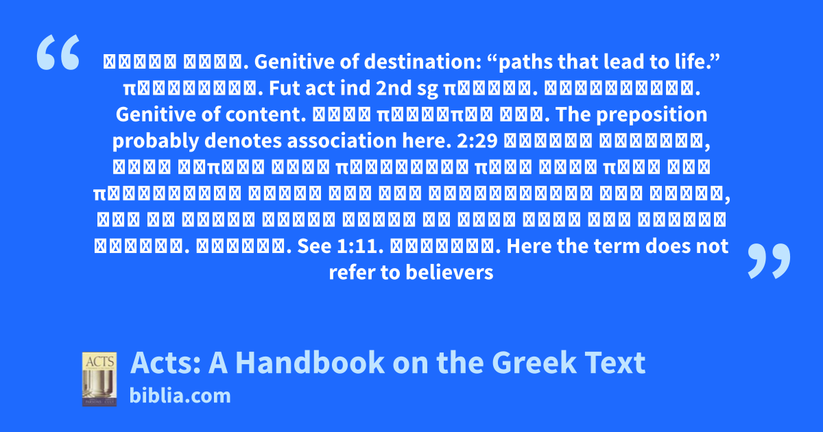 ὁδοὺς ζωῆς. Genitive of destination: “paths that lead to life.” πληρὡσεις. Fut act ind 2nd sg πληρόω. εὐφροσύνης. Genitive of content. μετὰ προσώπου σοὺ. The preposition probably denotes association here. 2:29 Ἄνδρες ἀδελφοί, ἐξὸν εἰπεῖν μετὰ παρρησίας πρὸς ὑμᾶς περὶ τοῦ πατριάρχου Δαυίδ ὅτι καὶ ἐτελεύτησεν καὶ ἐτάφη, καὶ τὸ μνῆμα αὐτοῦ ἔστιν ἐν ἡμῖν ἄχρι τῆς ἡμέρας ταύτης. Ἄνδρες. See 1:11. ἀδελφοί. Here the term does not refer to believers