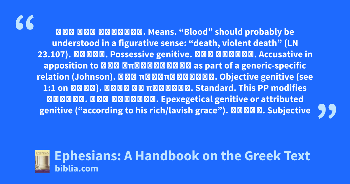 διὰ τοῦ αἵματος. Means. “Blood” should probably be understood in a figurative sense: “death, violent death” (LN 23.107). αὐτοῦ. Possessive genitive. τὴν ἄφεσιν. Accusative in apposition to τὴν ἀπολύτρωσιν as part of a generic-specific relation (Johnson). τῶν παραπτωμάτων. Objective genitive (see 1:1 on θεοῦ). κατὰ τὸ πλοῦτος. Standard. This PP modifies ἔχομεν. τῆς χάριτος. Epexegetical genitive or attributed genitive (“according to his rich/lavish grace”). αὐτοῦ. Subjective
