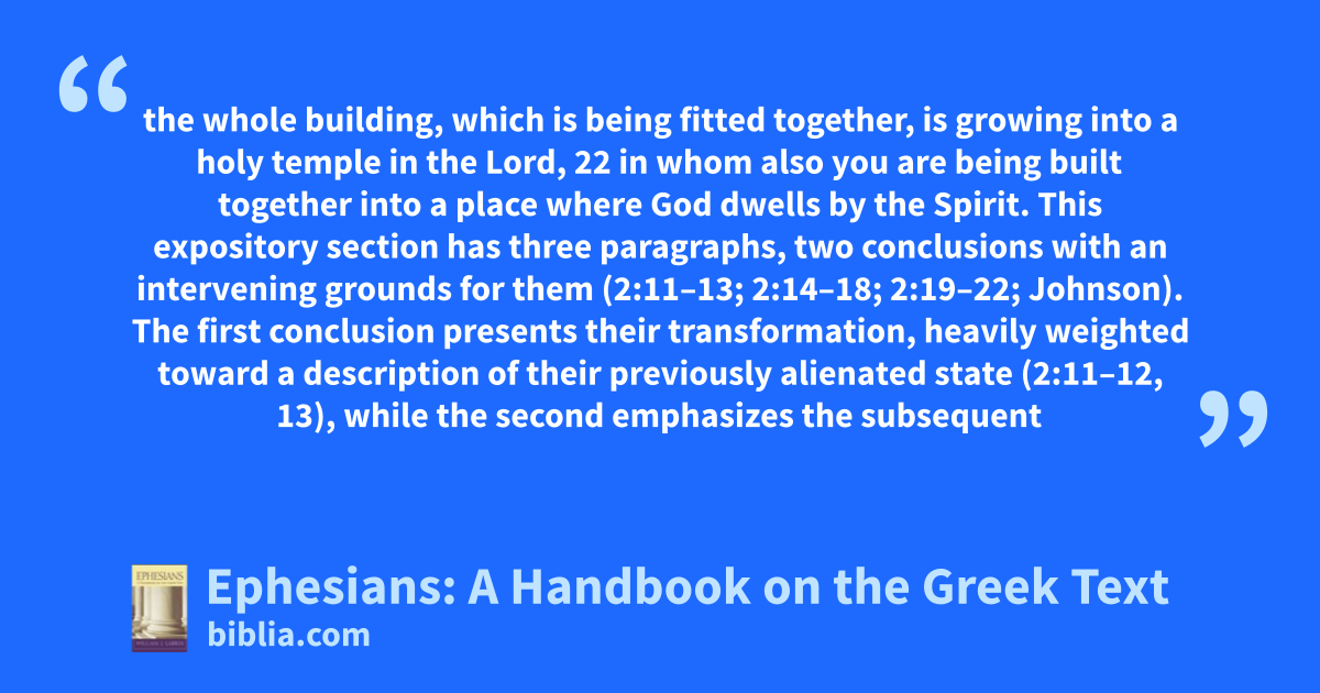 the whole building, which is being fitted together, is growing into a holy temple in the Lord, 22 in whom also you are being built together into a place where God dwells by the Spirit. This expository section has three paragraphs, two conclusions with an intervening grounds for them (2:11–13; 2:14–18; 2:19–22; Johnson). The first conclusion presents their transformation, heavily weighted toward a description of their previously alienated state (2:11–12, 13), while the second emphasizes the subsequent