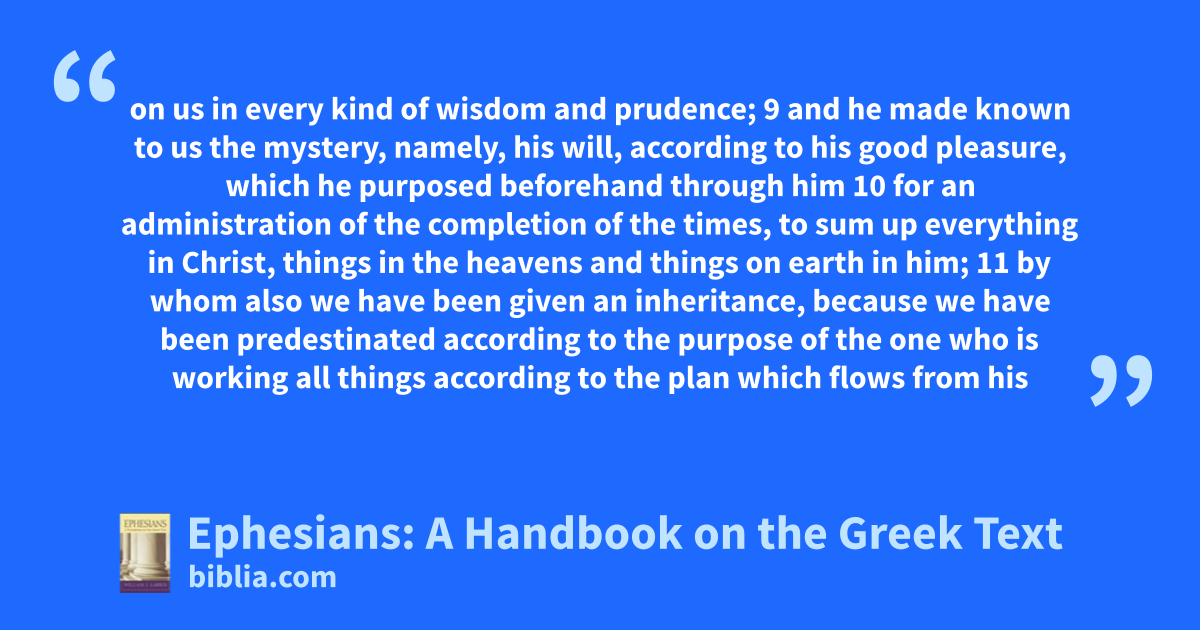 on us in every kind of wisdom and prudence; 9 and he made known to us the mystery, namely, his will, according to his good pleasure, which he purposed beforehand through him 10 for an administration of the completion of the times, to sum up everything in Christ, things in the heavens and things on earth in him; 11 by whom also we have been given an inheritance, because we have been predestinated according to the purpose of the one who is working all things according to the plan which flows from his