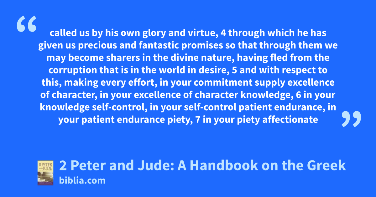 called us by his own glory and virtue, 4 through which he has given us precious and fantastic promises so that through them we may become sharers in the divine nature, having fled from the corruption that is in the world in desire, 5 and with respect to this, making every effort, in your commitment supply excellence of character, in your excellence of character knowledge, 6 in your knowledge self-control, in your self-control patient endurance, in your patient endurance piety, 7 in your piety affectionate