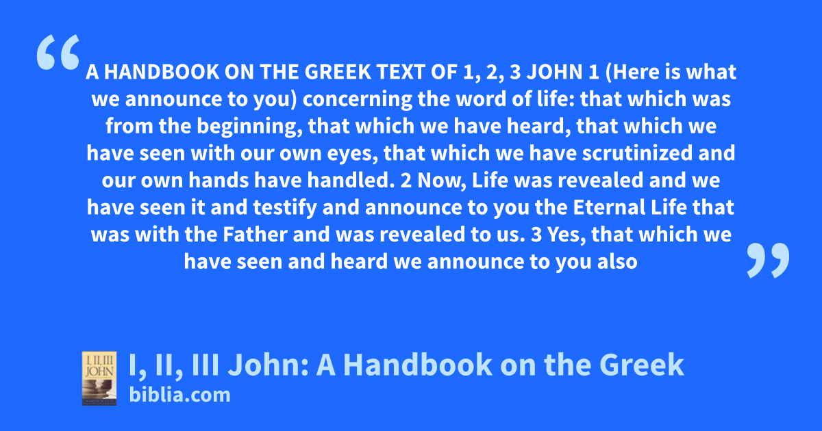 A HANDBOOK ON THE GREEK TEXT OF 1, 2, 3 JOHN 1 (Here is what we announce to you) concerning the word of life: that which was from the beginning, that which we have heard, that which we have seen with our own eyes, that which we have scrutinized and our own hands have handled. 2 Now, Life was revealed and we have seen it and testify and announce to you the Eternal Life that was with the Father and was revealed to us. 3 Yes, that which we have seen and heard we announce to you also